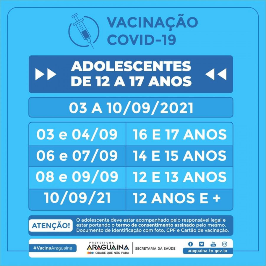 A Prefeitura de Araguaína anunciou na noite desta quarta-feira (1º) o início da vacinação de adolescentes entre 12 e 17 anos. A imunização deste grupo começa a partir da próxima sexta-feira, 3.