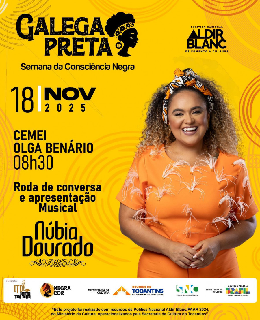 O Instituto Terra Dourada dá início, nesta terça- feira, 18, à segunda edição do Projeto Galega Preta: Valorização da Cultura Afro-Brasileira, idealizado pela cantora tocantinense Núbia Dourado. Premiada pela Política Nacional Aldir Blanc (PAAR 2024), a iniciativa levará rodas de conversa, apresentações musicais e oficinas culturais a quatro escolas de Palmas, entre os dias 18 e 19 de novembro, integrando a programação da Semana da Consciência Negra.