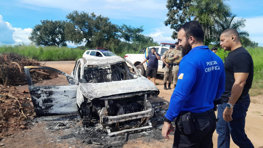 Durante a vistoria, foi constatado que o carro havia sido parcialmente desmontado antes de ser incendiado. O veículo estava sem rodas, bateria e volante, o que indica a possível retirada de peças para comercialização ilegal.