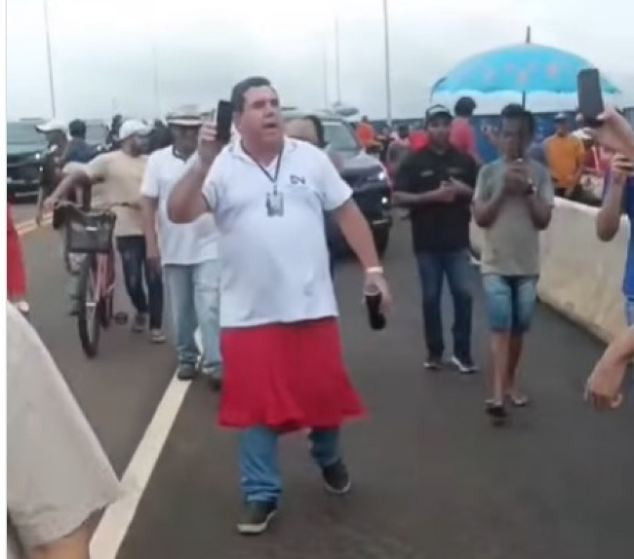 O comunicador Edilson, responsável pela página Destaque Notícias, atravessou a ponte vestindo uma saia vermelha, tornando-se uma atração à parte no evento.