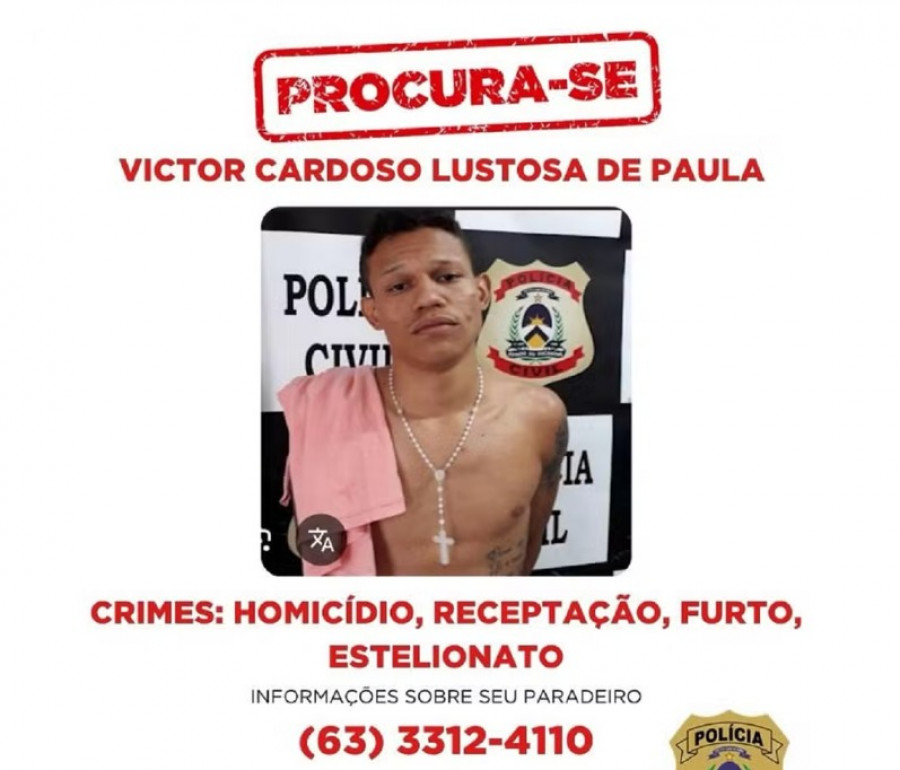 Victor Cardoso Lustosa de Paula, que responde por crimes de homicídio, receptação, furto e estelionato. De acordo com a SSP-TO, um inquérito está instaurado na 85ª Delegacia de Polícia de Cariri do Tocantins para apurar as circunstâncias da fuga.