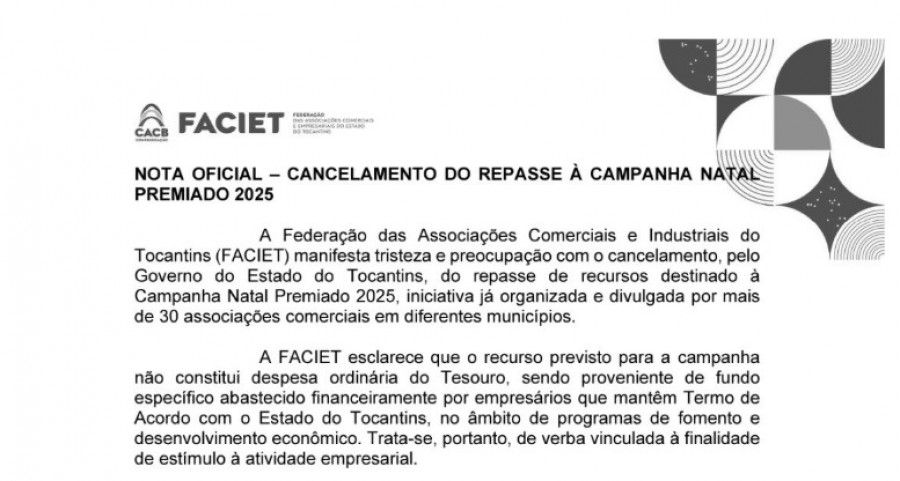 Em nota oficial, a Federação das Associações Comerciais e Industriais do Tocantins (FACIET) manifestou tristeza e preocupação diante do cancelamento, por parte do Governo do Estado, do repasse dos recursos destinados à Campanha Natal Premiado 2025. O documento foi divulgado nesta terça-feira, 23, e é assinado pela presidente da entidade, Antônia Lopes Gonçalves.
