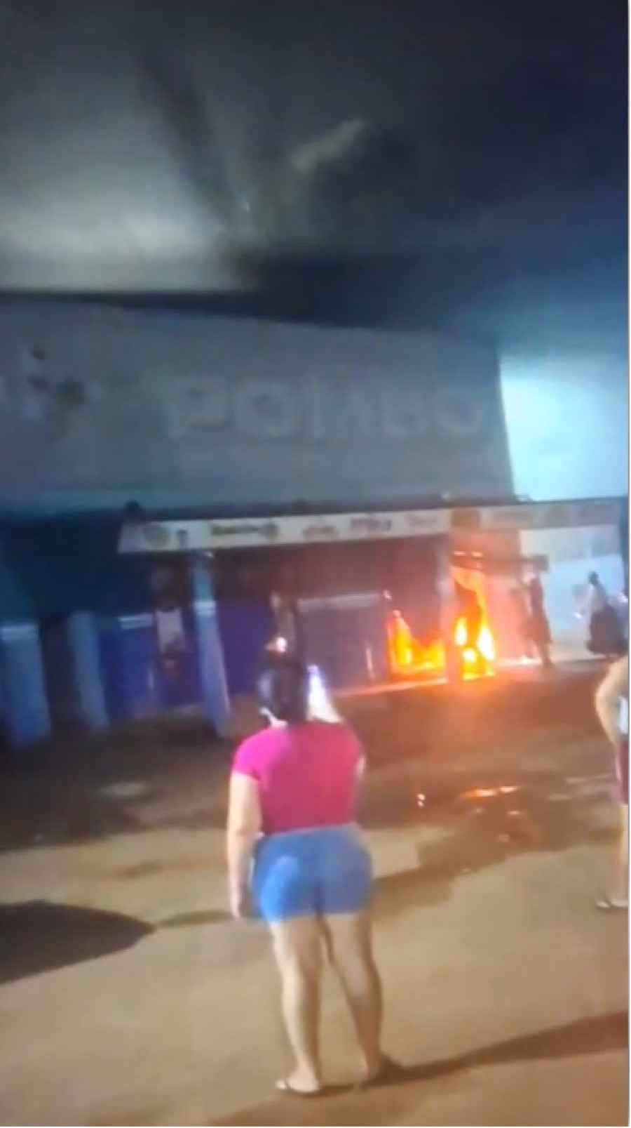 Vídeos gravados por populares mostram o momento do incêndio. Nas imagens, é possível ver chamas intensas no interior do supermercado Super Pombo, enquanto moradores tentam conter o fogo com pó químico.