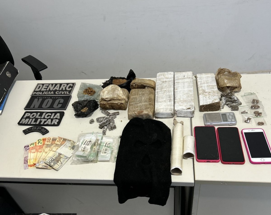 Durante revista na residência, foram encontrados uma balança de precisão, três aparelhos celulares e porções de substâncias análogas à maconha, entregues voluntariamente por D.N.A. Com o apoio do Núcleo de Operações com Cães (NOC) da Polícia Penal, os policiais realizaram buscas no matagal próximo e localizaram uma espécie de um tonel de leite enterrado contendo mais porções de substâncias análogas à maconha e crack.