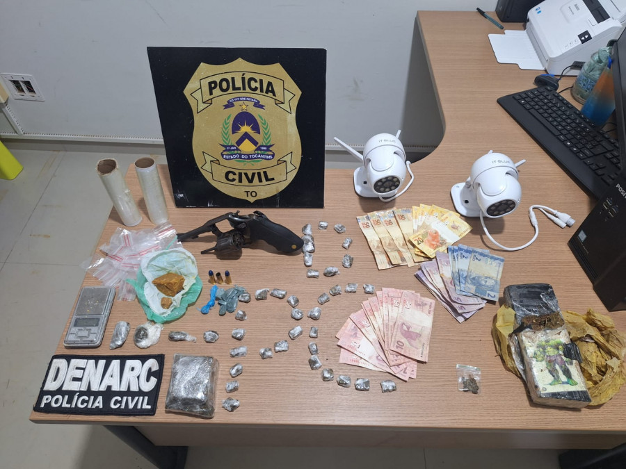 No interior do imóvel, os policiais localizaram 39 porções fracionadas de maconha, dois tijolos da mesma substância, quatro porções de crack, além de R$ 442,00 em dinheiro, balança de precisão e material utilizado para embalar entorpecentes. Também foi apreendido um revólver calibre .38, com duas munições intactas e uma deflagrada.