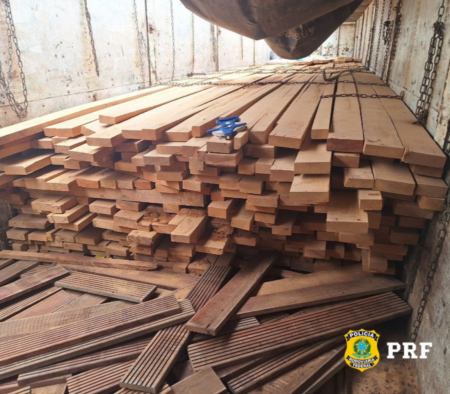 Na sequência, a equipe realizou a verificação do compartimento de carga, onde encontrou madeira serrada, contrariando a informação inicial do motorista.