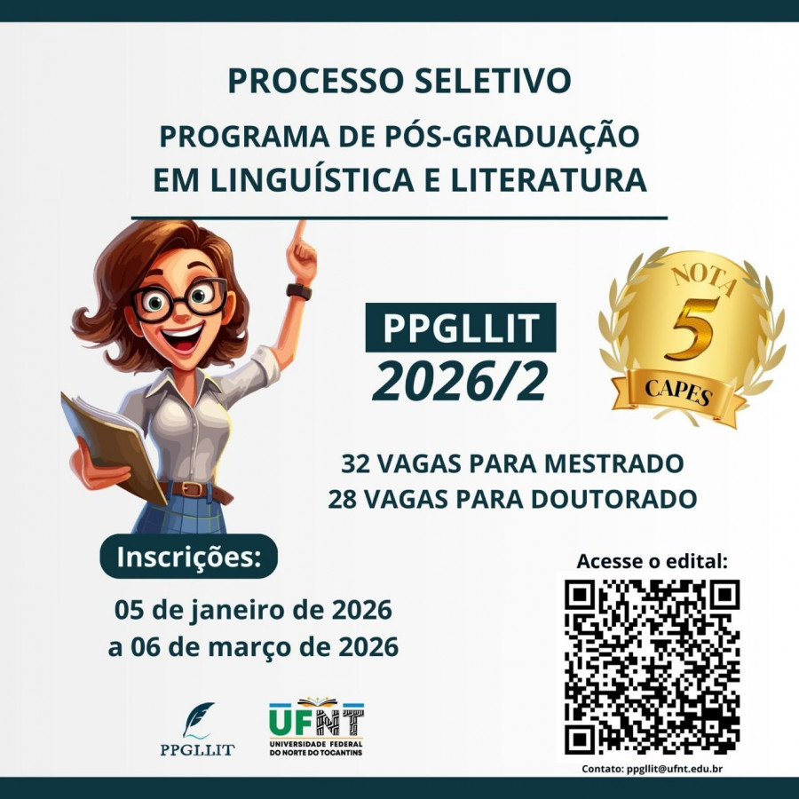 Um dos melhores Programas da Região Norte O Programa de Pós-Graduação em Linguística e Literatura - PPGLLIT da Universidade Federal do Norte do Tocantins - UFNT, está com inscrições abertas para ingresso nos cursos de Mestrado e de Doutorado em Linguística e Literatura. O Programa é ofertado no Campus de Araguaína, de forma gratuita, com aulas presenciais.