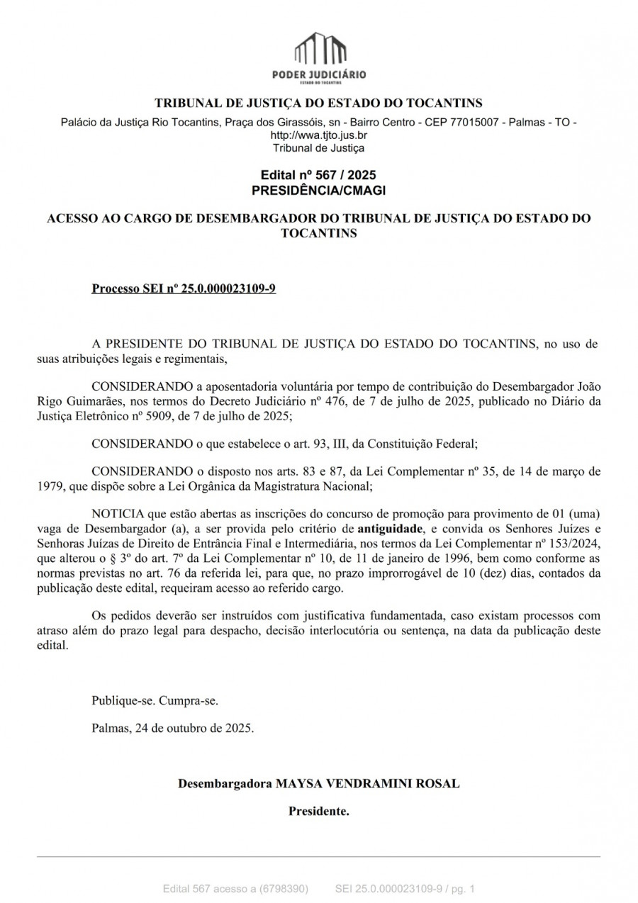 O Tribunal de Justiça do Tocantins (TJTO) abriu o processo de seleção para o preenchimento de uma vaga de desembargador(a). O edital nº 567/2025, assinado pela presidente do TJTO, desembargadora Maysa Vendramini Rosal, nesta sexta-feira (24/10), estabelece que a vaga será preenchida pelo critério de antiguidade. A abertura da seleção decorre da aposentadoria voluntária do desembargador João Rigo Guimarães, oficializada em julho deste ano.