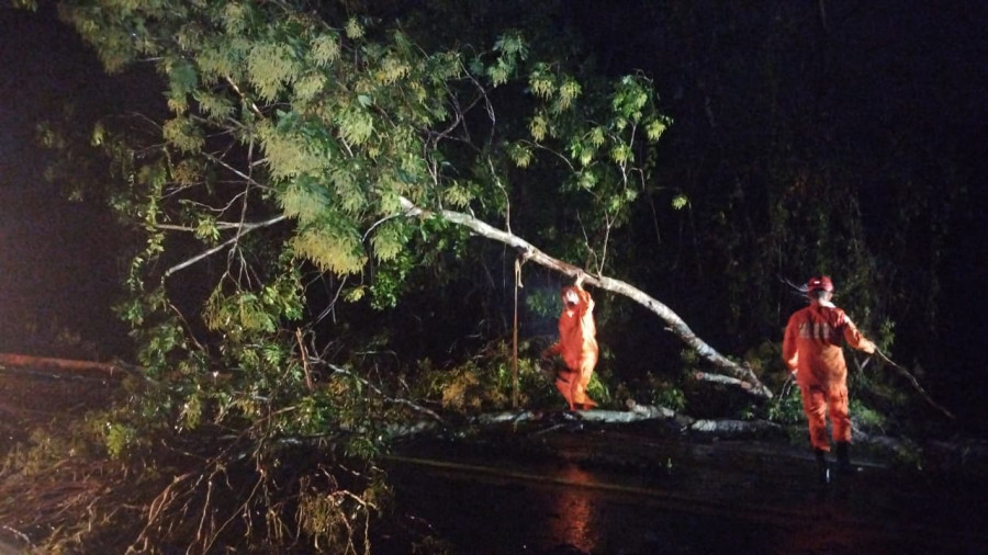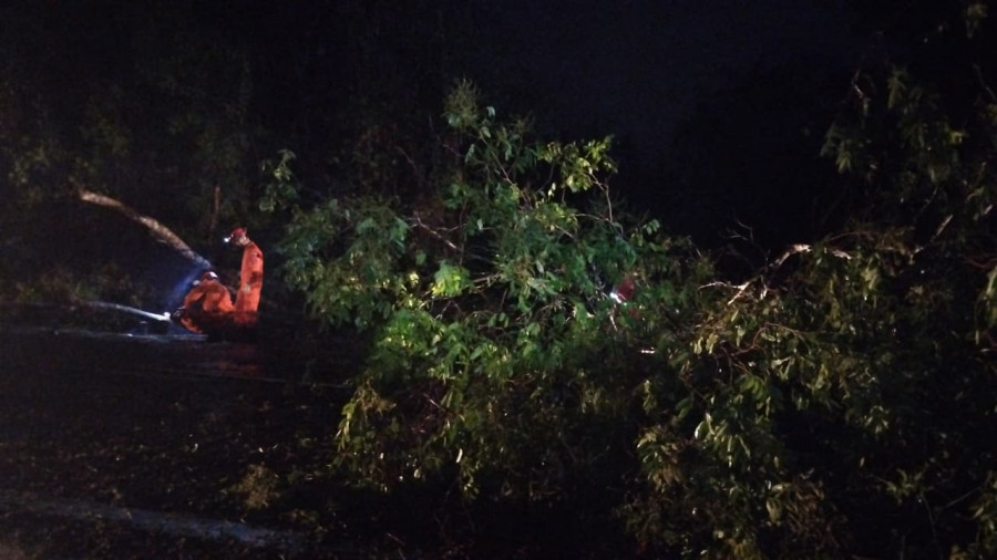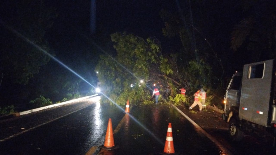 De acordo com informações, a forte ventania e a chuva que atingiram a região provocaram a queda das árvores, bloqueando cerca de 75% da via e permitindo o tráfego apenas por um dos acostamentos, o que deixou o trânsito arriscado no local.